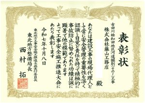 2025.10.10 表彰・受賞 SAFETY2025(現場代理人)表彰 令和7年10月8日 東北地方工事安全施工推進大会実行委員長より SAFETY2025(現場代理人)に表彰をされました。 工事名 吉田川桧和田地区河道掘削(その1)工事 ( 詳細は、施工実績をご覧ください。) 表彰・受賞 東北地方整備局 優良工事技術者表彰前の記事